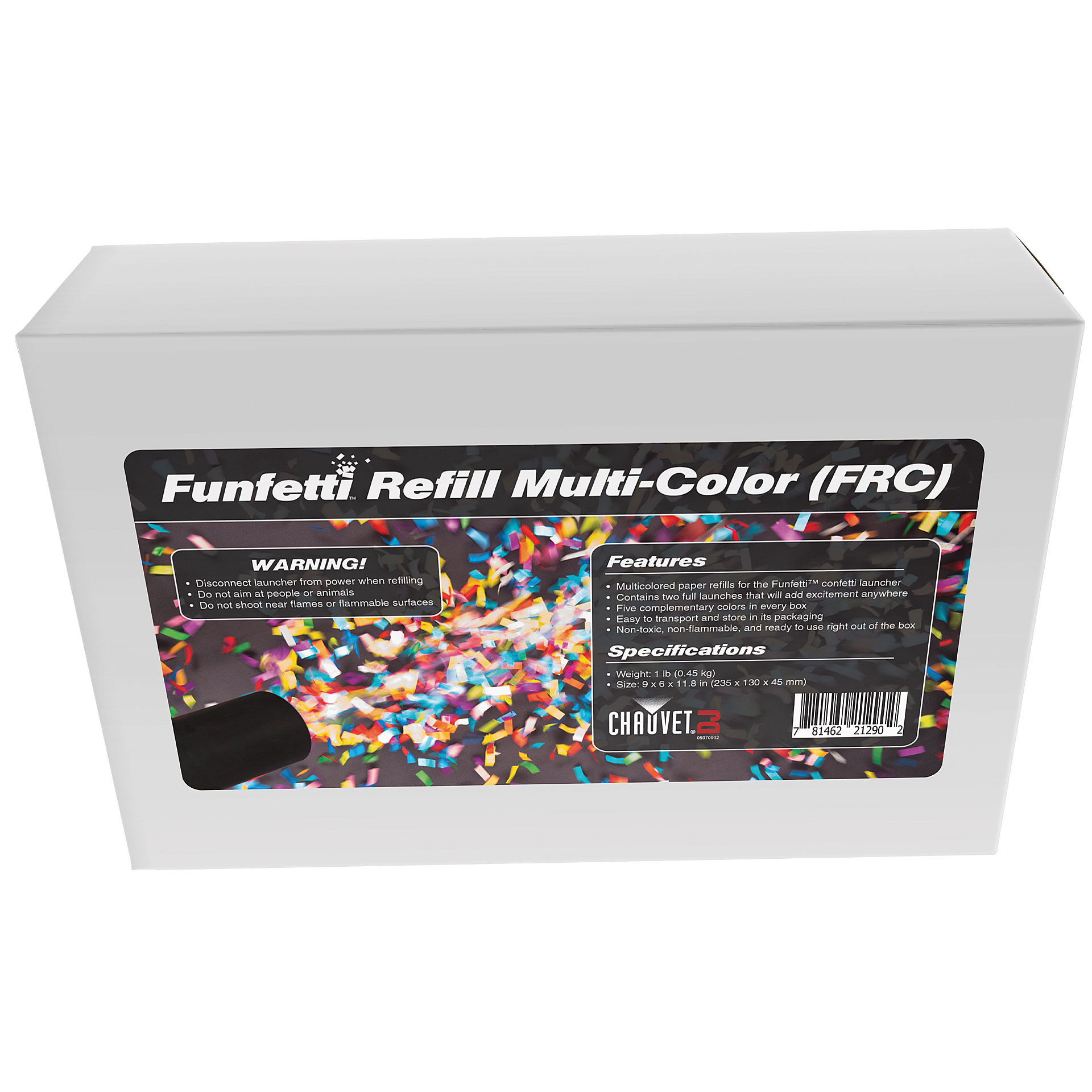 The CHAUVET DJ Funfetti Shot Refill – Color is a multi-colored paper confetti refill for the Funfetti Shot confetti launcher. It contains two full confetti launches and is easy to transport and store in its packaging. Five complimentary colors in every box. The Funfetti Shot Refill – Color is non-toxic, non-flammable and ready to use right out of the box.